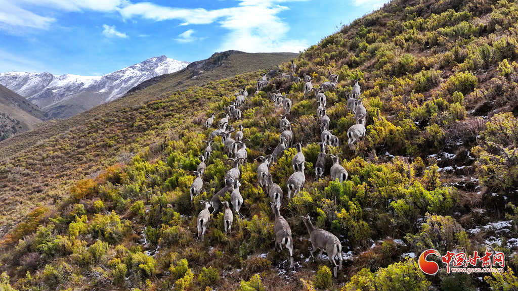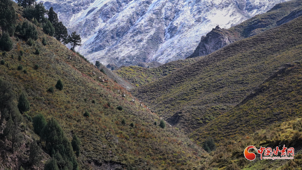 9月25日,位于甘肅省河西走廊的張掖市山丹馬場(chǎng)秋日初雪,遠(yuǎn)處的祁連山上積雪與松柏交相輝映,巖羊在雪地里悠閑覓食,宛如一幅和諧的生態(tài)畫卷。