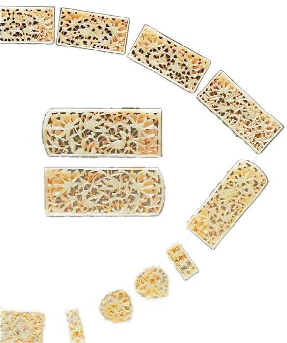 排方長5.1厘—7.6厘米、寬3.3厘米、厚0.7厘米,1955年蘭州市上西園明墓出土。青灰色和田玉鏤雕而成,包括三臺1、弼輔4、圓桃4、鉈尾2、排方7,均透雕牡丹花枝,邊緣有界欄。其中四塊較大的長條排方,雕飾最為精美,于繁花密葉間配置一對雉雞,構(gòu)圖繁縟,富于變化,顯示出工匠高超的技術(shù)造詣。