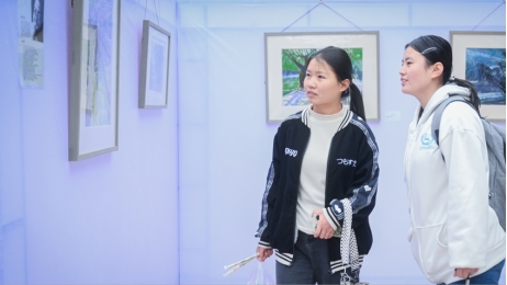 該校學(xué)生在認(rèn)真品鑒精品畫作