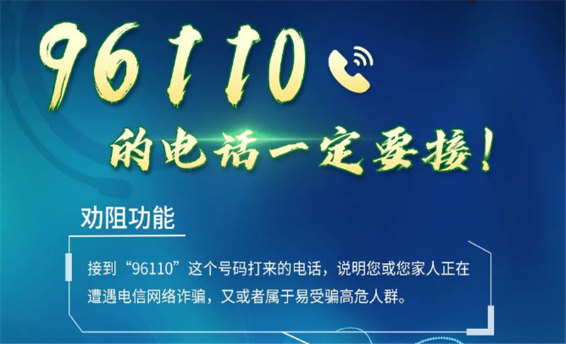 公安機(jī)關(guān)提醒:96110是官方預(yù)警勸阻專線,如接到“96110”號碼來電,說明機(jī)主本人或其家人正遭遇電信網(wǎng)絡(luò)詐騙,請一定及時接聽并耐心聽取民警的勸阻提示,避免上當(dāng)受騙。