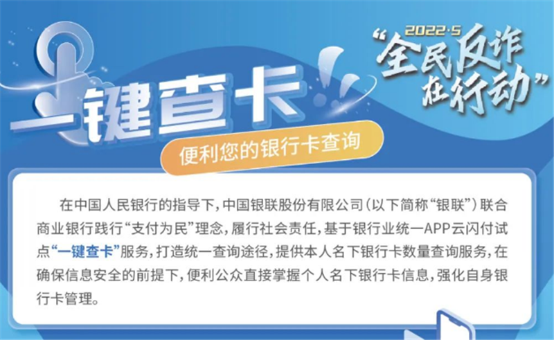 為解決群眾對于跨行銀行卡賬戶查詢的訴求,2021年12月,人民銀行指導(dǎo)中國銀聯(lián)股份有限公司聯(lián)合商業(yè)銀行基于銀行業(yè)統(tǒng)一APP云閃付試點“一鍵查卡”功能,打造統(tǒng)一查詢途徑,向公眾提供銀行卡數(shù)量、每張卡的銀行名稱、借貸記屬性、脫敏卡號等信息的查詢,在確保信息安全的前提下,便利公眾直接掌握個人名下銀行卡信息,強(qiáng)化自身銀行卡管理。