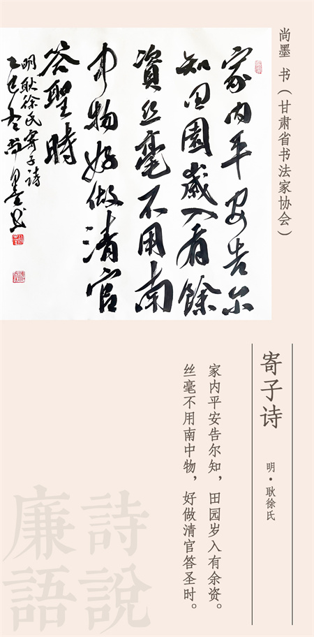耿庭柏少年得志,20歲即中進士、任知縣,可謂春風(fēng)得意。但耿徐氏卻并沒有一味沉溺于兒子帶來的榮耀,而是很冷靜、及時地寫了這首詩寄給他,給予諄諄告誡。詩句很平實,意思很明確,家中一切都好,田園的收入完全能夠養(yǎng)活家人。所以山陰(即今紹興)這個富庶之地的一絲一毫你都不可非法攫取來寄給我,只要你好好地做個清官來報答國家和黎民就足夠了。這首詩當時即傳誦一時,后來還被收入清代沈德潛編纂的《明詩別裁集》、宋弼編纂的《山左明詩鈔》等詩歌選集中。耿家為書香門第,科甲鼎盛,先后出過七個進士,但他們的詩詞作品都沒有流傳下來,反而是耿徐氏的這首詩為家族撐了門面。