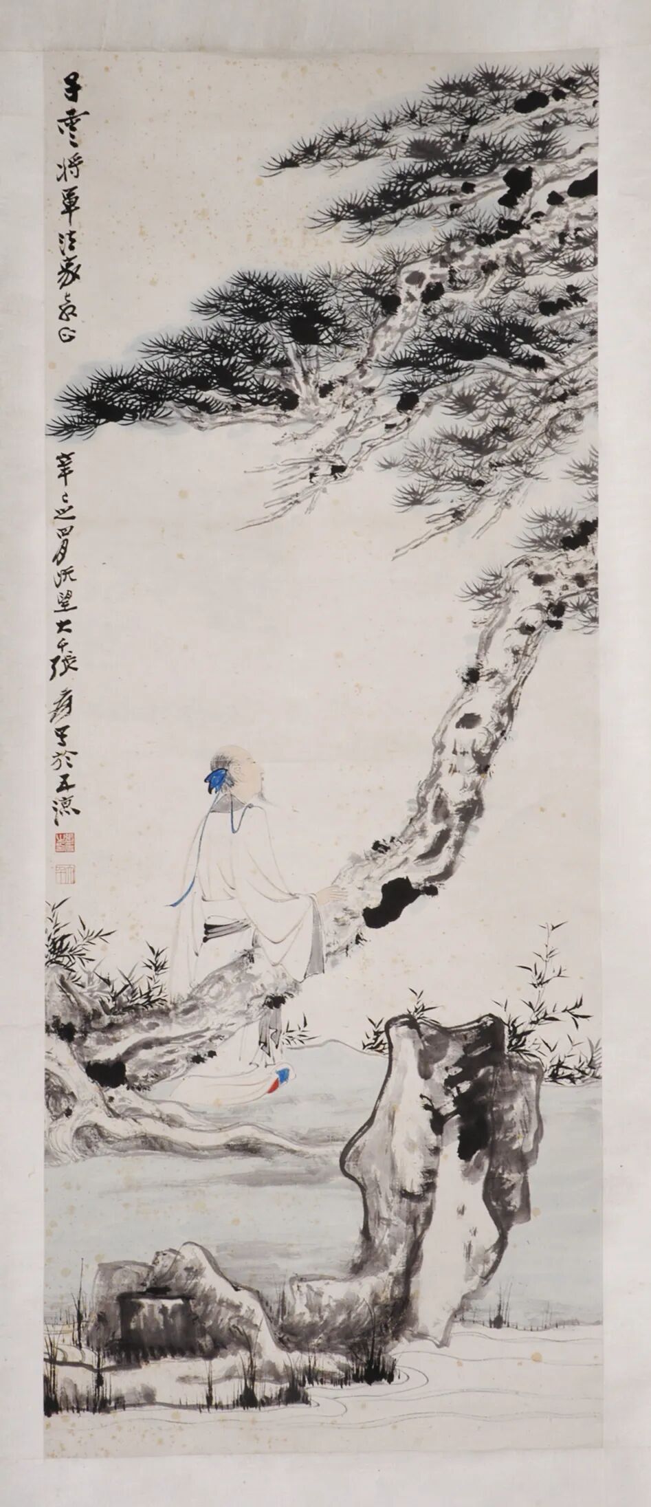 在松與士的意象組合上,張大千運(yùn)用“攢針”與“點(diǎn)簇”相結(jié)合的技法,通過墨色濃淡變化,既表現(xiàn)松針的茂密層次,又展現(xiàn)枝干的虬曲質(zhì)感。高士形象以簡(jiǎn)練而富有彈性的線條勾勒,衣紋處理融匯了唐代吳道子“吳帶當(dāng)風(fēng)”的飄逸與宋代李公麟“鐵線描”的勁挺,更注入張大千自創(chuàng)的雄渾筆性。人物神情安詳,目視遠(yuǎn)方,與蒼松形成虛實(shí)相生的藝術(shù)效果。