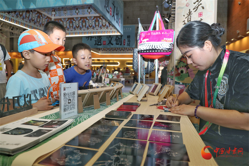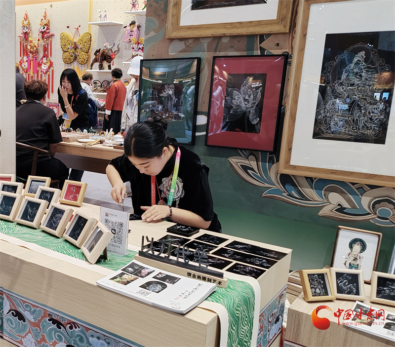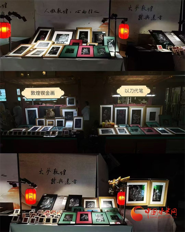 第八屆敦煌文博會(huì)非遺文創(chuàng)展區(qū),非遺藝人王婕正在展示鍥金畫技藝。通俗來(lái)說(shuō)就是在金屬板上刻畫,每一個(gè)線條都要用刻刀在金屬板材上留下印痕。