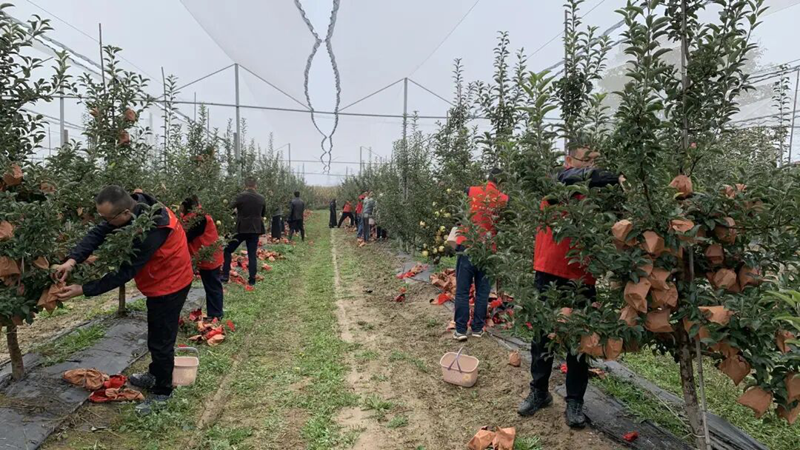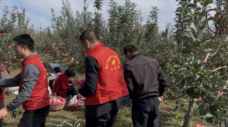 在果農(nóng)岳世德家的果園里,平日里伏案工作的干部職工們,此刻化身“采摘工”,忙碌的身影在果樹(shù)間穿梭,鮮艷的紅馬甲與紅蘋(píng)果互相映襯。