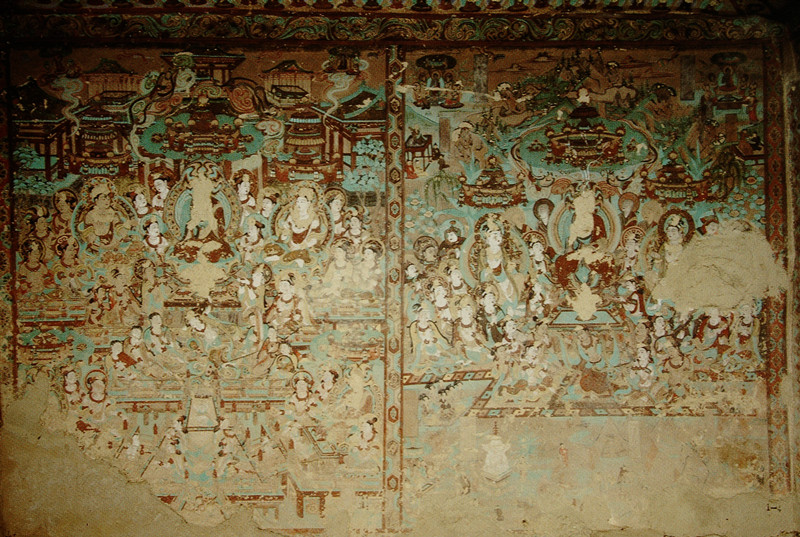 畫面中的人物造型嚴(yán)格遵循唐代仕女的畫風(fēng)繪制,顯得豐腴飽滿,恰似盛唐時期雍容華貴的氣質(zhì)寫照。線描寫實明快,流暢飛動,一氣呵成,仿佛是畫師用靈動的筆觸在墻壁上勾勒出的生命樂章。畫面的顏色以石綠、赭黃、鉛白為主色。整個畫面顯得典雅、嫵媚,令人賞心悅目。雖然伎樂天頭部原本貼金的頭飾已經(jīng)剝落,但歲月的痕跡并未減損她雍容華貴的氣質(zhì),反而更增添了一份歷史的厚重感。