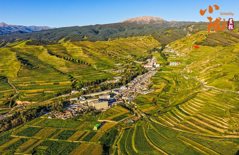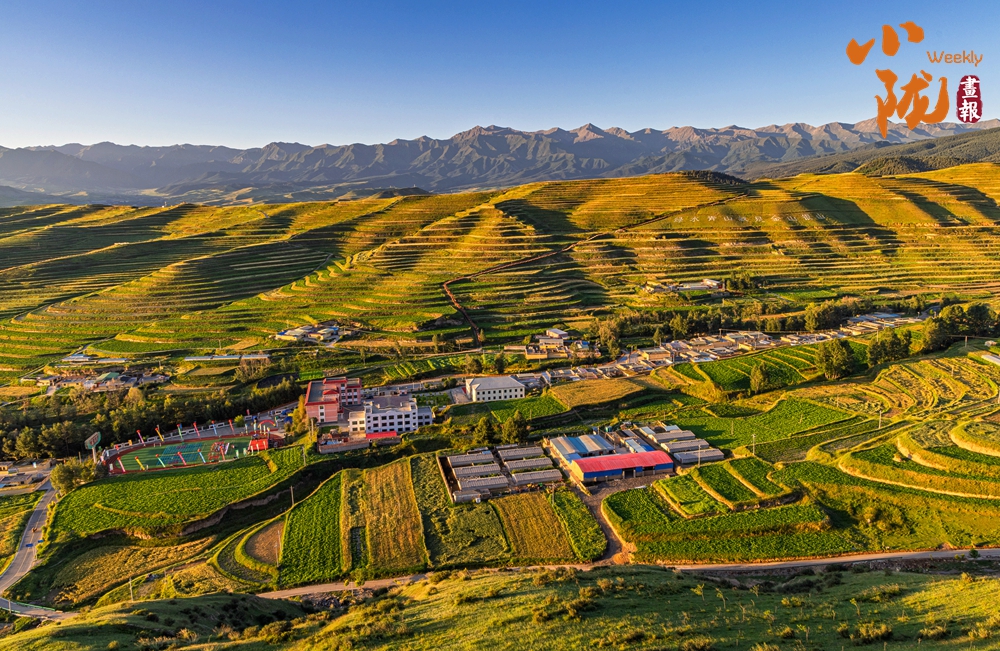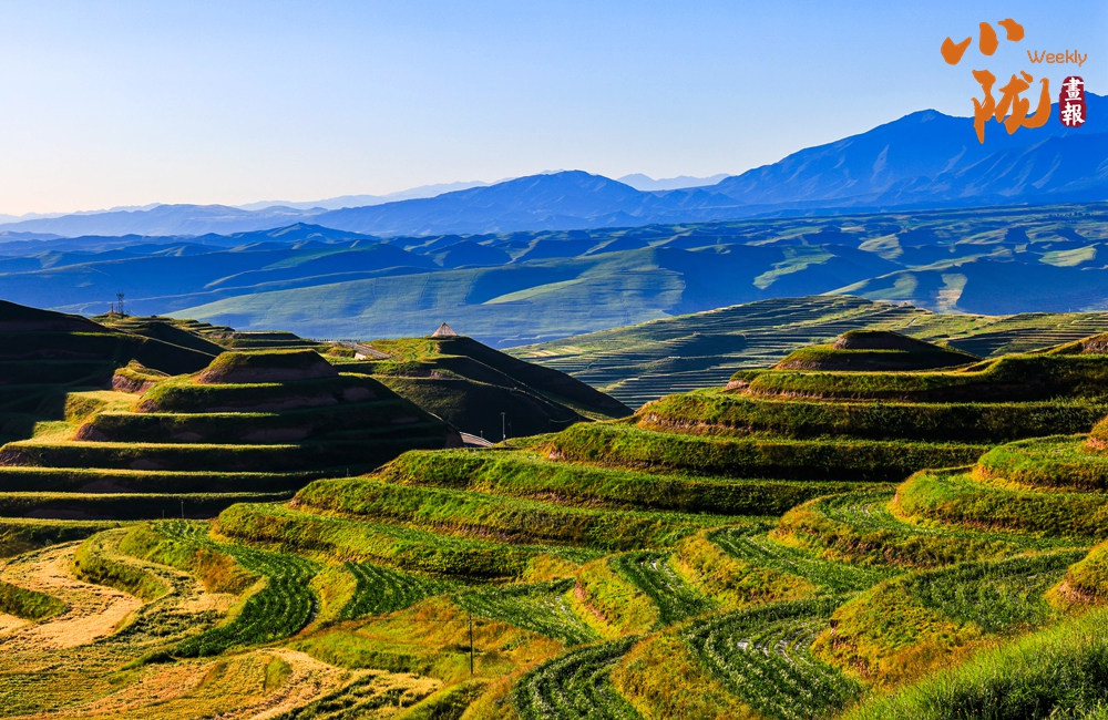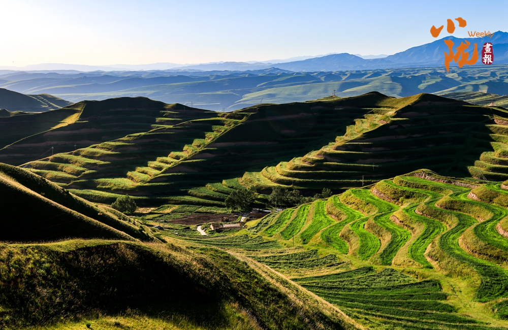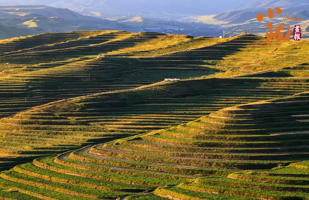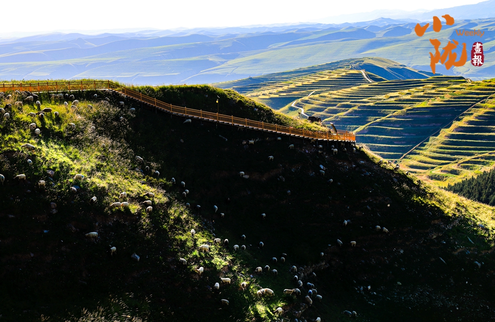 溝壑縱橫,滿(mǎn)目生綠。廣袤的田野在陽(yáng)光下盡情綻放著大自然的絢麗多彩,熱烈地期盼著新季節(jié)的到來(lái);羊群如散落的云朵,在坡地間緩緩移動(dòng),盡享這份寧?kù)o與和諧。