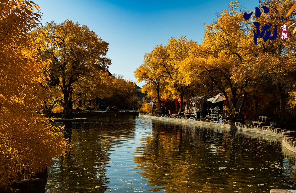 成千上萬棵金黃的胡楊沿峽谷肌理蜿蜒,虬枝盤曲如歲月鐫刻的詩行,清溪潺潺從樹下流過,將胡楊的金黃、沙山的黛青、天空的湛藍揉成一幅流動的畫。