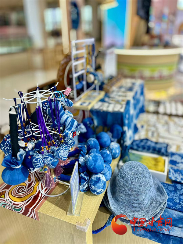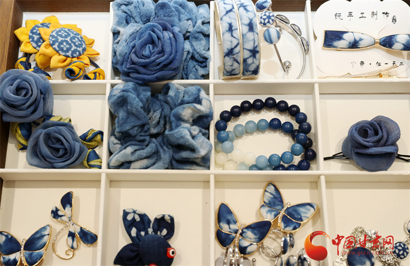 染好的布匹還要經過脫漿、清洗、陰干,最后才是拆線、整理。當一塊完整的藍印花布展現在眼前時,李梅總會輕輕撫摸布料,仿佛在與草木對話。她的工作室里,掛滿了用藍染制成的物件:桌布上印著成片的板藍根葉,茶席邊緣綴著小巧的藍染布扣,就連她日常穿的棉麻衫,也是自己染的淡藍色。“這些布不是冰冷的商品,是帶著土地溫度的生活。”李梅說,去年她在平涼古城開了一間“藍染生活館”,游客可以跟著她學種板藍根、體驗扎染,很多人第一次發(fā)現,原來衣服上的藍色可以來自田野,非遺技藝能如此貼近日常。