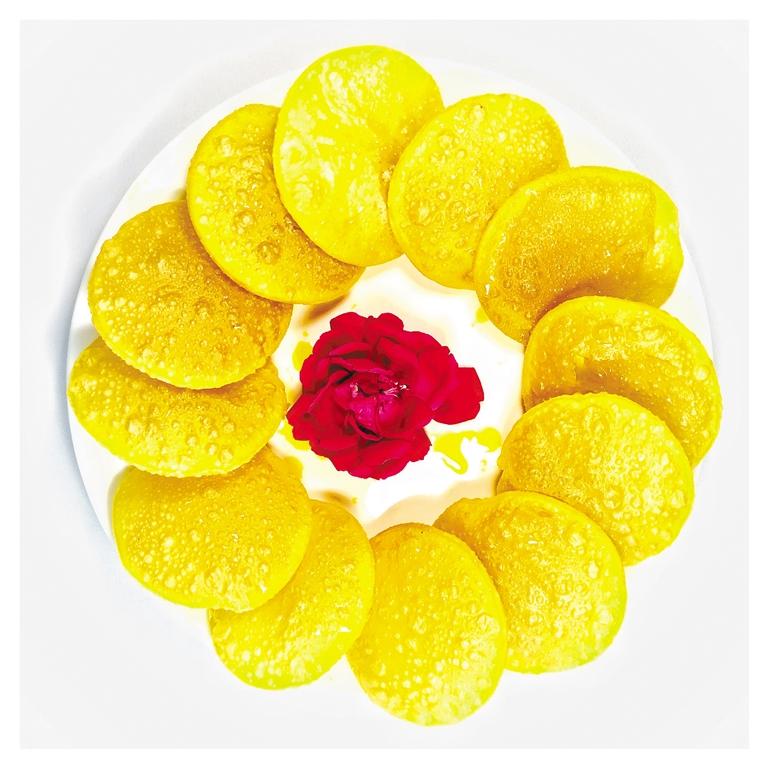 折橋?yàn)车拿媸持?,燙面油香的地位自比尋常,往往在冷熱拼盤(pán)交錯(cuò)中,它已經(jīng)被端上桌,因?yàn)樗钦蹣驗(yàn)橙思抑凶罹呦笳饕饬x的一種食物。油香炸得好不好,就可以衡量出這家農(nóng)家樂(lè)廚師的技藝。