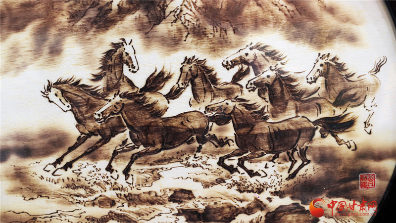 從學(xué)徒到代表性傳承人,張志光的堅(jiān)守藏在日復(fù)一日的練習(xí)里。他不僅精通山丹烙畫(huà)的選材、畫(huà)面設(shè)計(jì)及裝飾工藝,更在2018年邁出創(chuàng)新步伐——將山丹馬元素融入創(chuàng)作。手持電烙鐵在木板上游走,他筆下的山丹馬或奔騰跳躍、或昂首嘶鳴,線條流暢、明暗有致,仿佛被賦予生命,盡顯西北大地的豪邁神韻。“山丹烙畫(huà)是我一生的熱愛(ài),早成了生活里離不開(kāi)的部分。”張志光的話語(yǔ)里,滿(mǎn)是對(duì)這門(mén)技藝的深情。