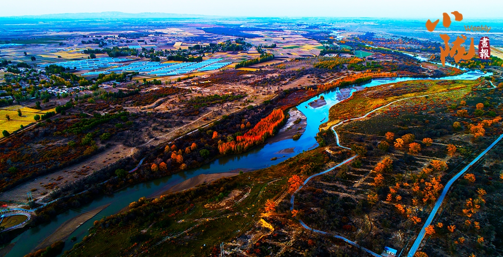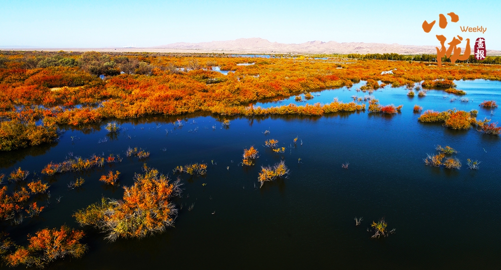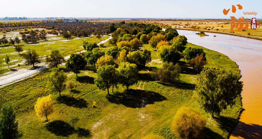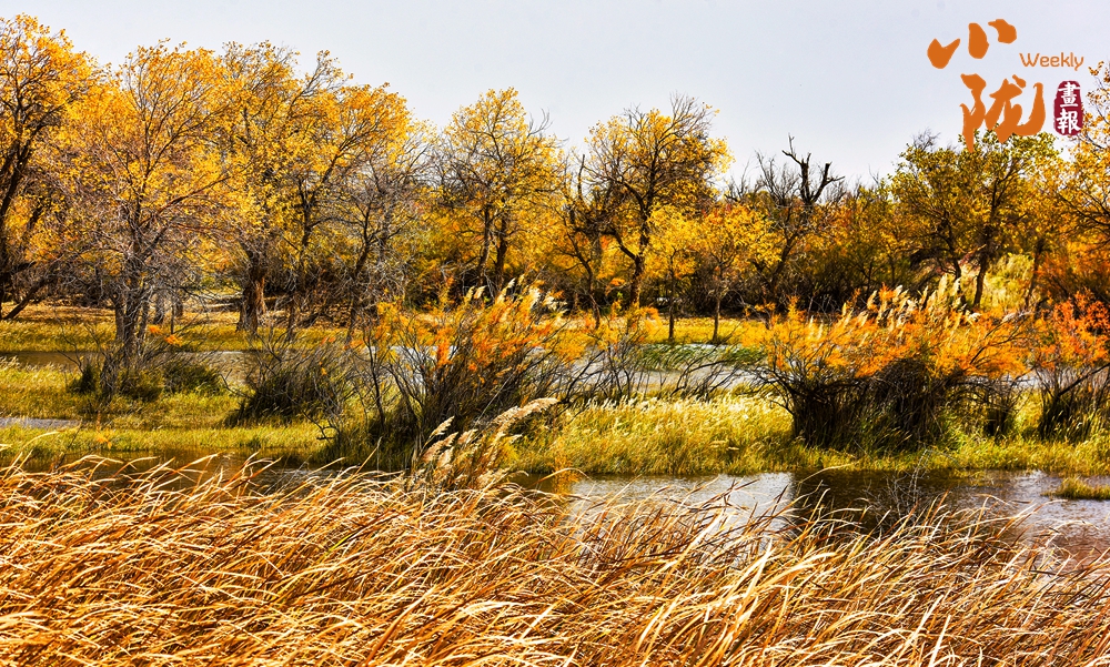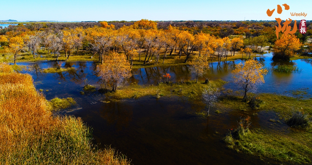 金色胡楊在陽光下泛著溫暖光澤,斑斕絢麗的蘆葦如金色絲帶點(diǎn)綴荒漠,與碧綠河水、湛藍(lán)天空構(gòu)成濃墨重彩的秋日圖景。