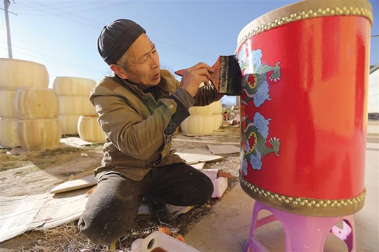 冬日農(nóng)閑時(shí)節(jié),在甘肅省定西市安定區(qū)鳳翔鎮(zhèn)北廿鋪村,牛皮鼓手工制作藝人利用晴好天氣趕制訂單牛皮鼓,供應(yīng)市場。該村每年可制作各類牛皮鼓3000余面,牛皮鼓手工制作涵蓋選材、解板、刨制鼓腔、蒙皮、釘釘?shù)榷嗟拦ば?,再?jīng)數(shù)天晾曬和反復(fù)調(diào)試才能最終制成。牛皮鼓是我國的傳統(tǒng)打擊樂器,在西北地區(qū)用于民間社火表演等活動(dòng)。