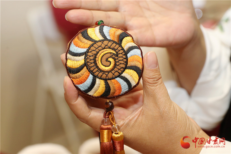真正讓她想“給香包加點新東西”,是一次省博看展的觸動。站在馬家窯彩陶罐前,她盯著罐身流轉的旋渦紋出了神:“這么好看的紋路,繡在香包上多妙?”后來去敦煌,莫高窟里飛天的飄帶、藻井的繁復花紋更讓她挪不開腳。回來的路上,一個念頭愈發(fā)清晰:要讓博物館里的文物“活”在香包里,讓老手藝沾染上“文化氣”。
